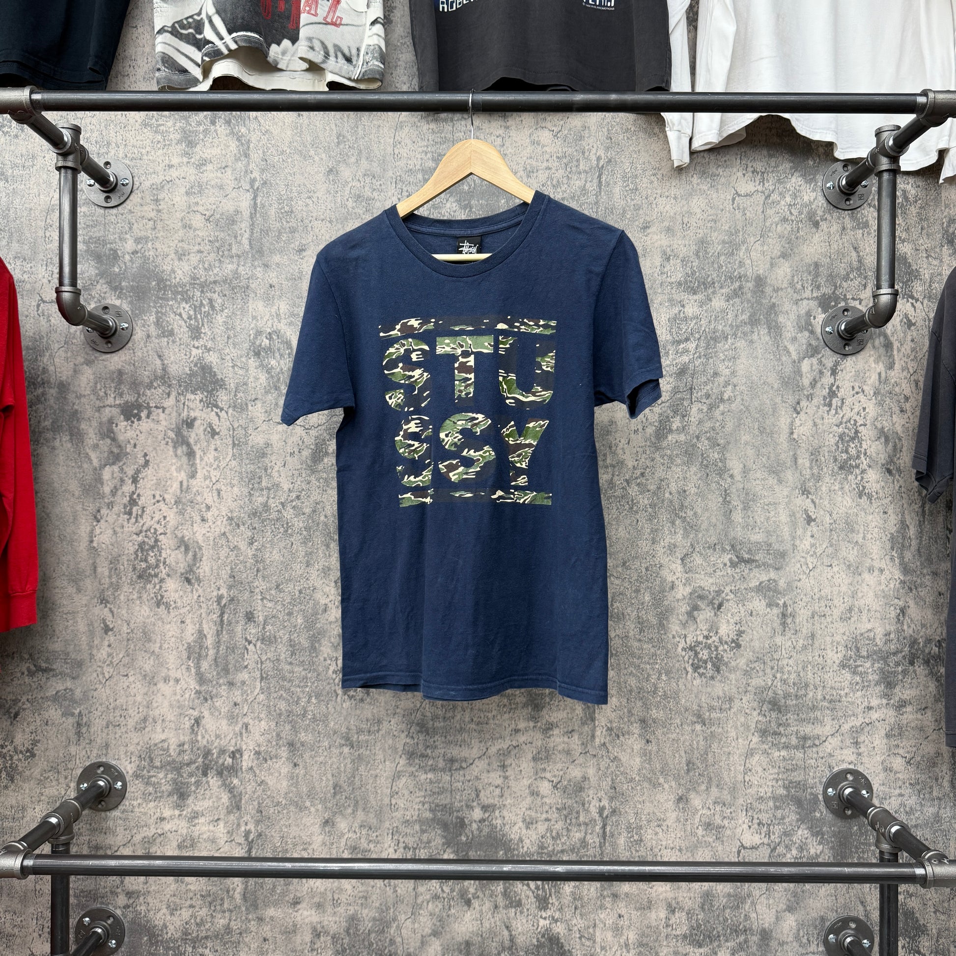 Stussy Camo Spellout Navy Tee SZ S